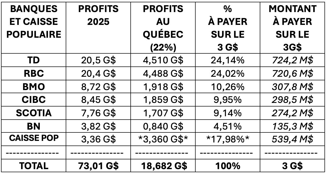 Les banques et la Caisse Populaire Desjardins ont généré des profits records en 2025 : on parle de plus de 73 G$ (incluant le Canada au complet ainsi que les profits réalisés en Bourse). En utilisant 22% (proportion de la population québécoise) comme indice de référence pour les Banques canadiennes (sauf pour Desjardins dont la très grande majorité des activités est au Québec), nous arrivons à ces montants approximatifs :