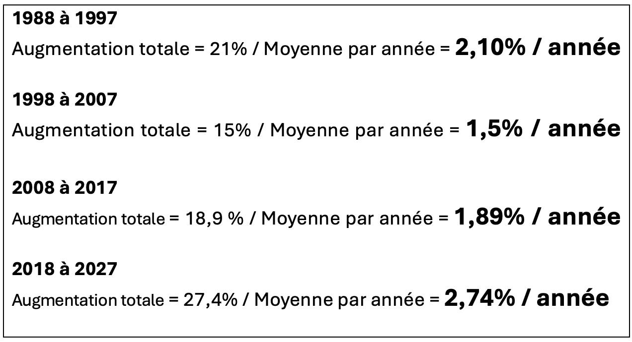 Selon les données des négociations depuis 1988, donc depuis 40 ans (les augmentations des dernières négociations culminent en 2027), voici en gros les résultats obtenus au fil des années :